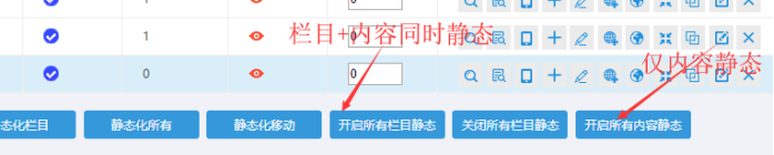 B:右邊的“開啟所有內容靜態”--------點擊下,表示開啟了內容頁靜態,但是欄目不靜態;標志是藍色的。