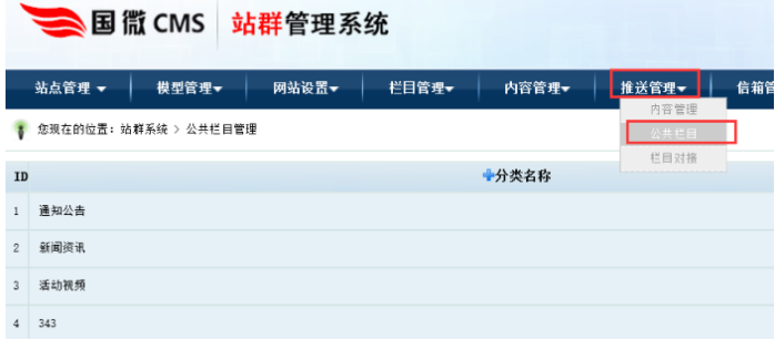 進入站群后臺---選擇推送管理----公共欄目;可以看到我們創建好的站群公共欄目