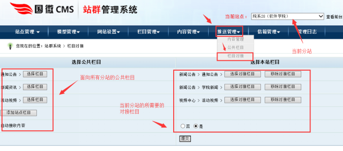 C:左邊選擇公共欄目;右邊選擇對應的本分站的欄目。那么主站推送的數據,先推給公共欄目,然后自動流到對應的分站欄目。