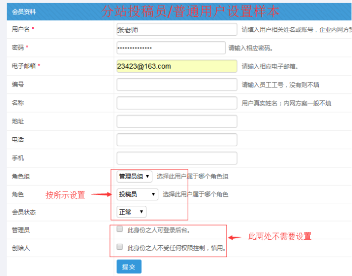 B:如果是站群的分站投稿員、主站的投稿員;添加賬號(hào)時(shí)候可以設(shè)置如下