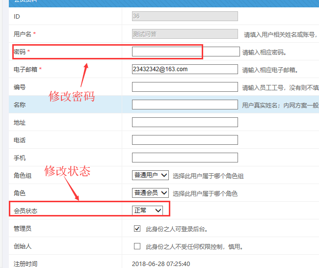 可以修改密碼、修改狀態(tài)(有時(shí)候剛剛添加的會(huì)員,需要重新編輯下,讓其他狀態(tài)是正常):