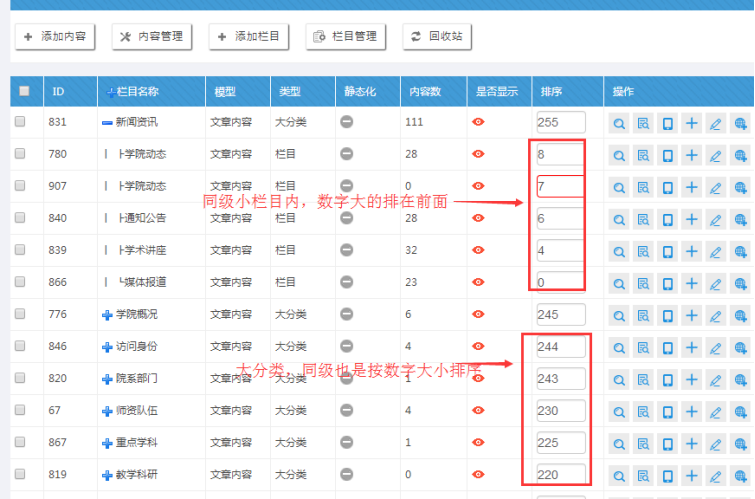 欄目排序:同屬一個大分類的小欄目,也是欄目和欄目數字比。和其他大分類的欄目數字大小無關。