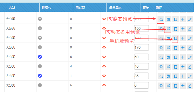 PC靜態預覽: 如果欄目設置了靜態,此按鈕優先預覽靜態;格式比如:域名/html/1285/ ; 如果沒有靜態,打開此按鈕是動態地址。