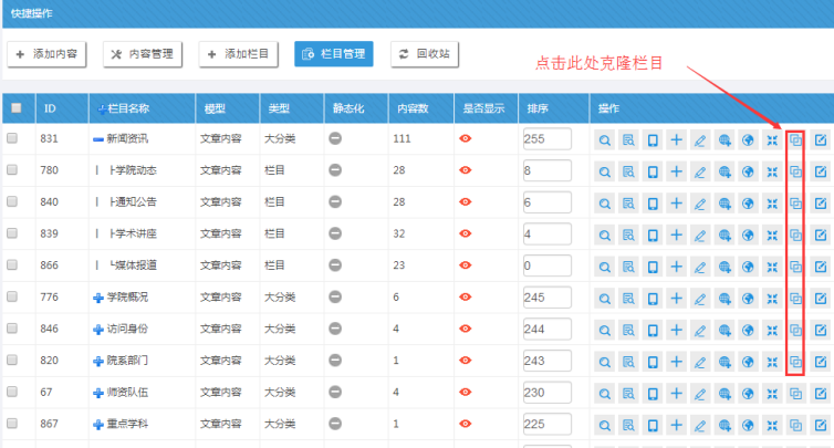 備注:我們可以克隆一個欄目, 也可以克隆整個大分類(里面的子欄目也克隆了)