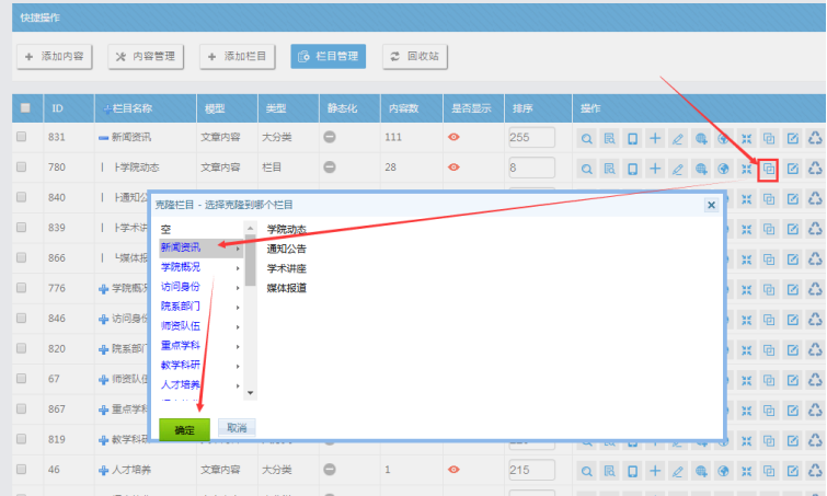 登陸后臺------進入欄目管理------點擊克隆按鈕-------選擇克隆欄目的歸屬-----點擊確定