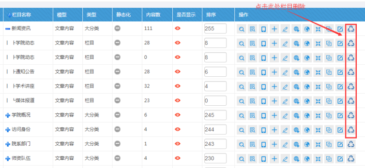 登陸后臺------進入欄目管理------點擊刪除欄目(欄目就進入了回收站,如果覺得是誤刪,可以恢復)