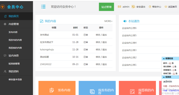 會員中心效果:會員中心功能包括投稿、內(nèi)容審核、數(shù)據(jù)刪除、更新首頁等功能;所有人的內(nèi)容操作基本都在會員中心進行。主站和分站都有各自的會員中心