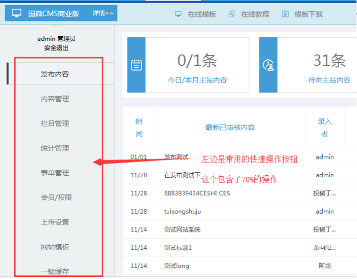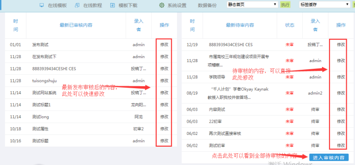 操作提示:此處可以快速修改最新發(fā)布內(nèi)容、最新需審核內(nèi)容;同時點擊鏈接可以進去列表;可以平常節(jié)約很多時間。