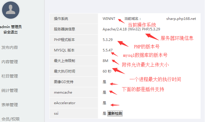 后臺初始頁左下方,此處可以看到安裝此網(wǎng)站的操作系統(tǒng)、數(shù)據(jù)庫版本、PHP版本、最大上傳設(shè)置、各個插件