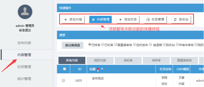 內(nèi)容管理:此處可以進行文章內(nèi)容刪除、編輯、審核、設(shè)置屬性、搜索篩選、推送分站等操作。