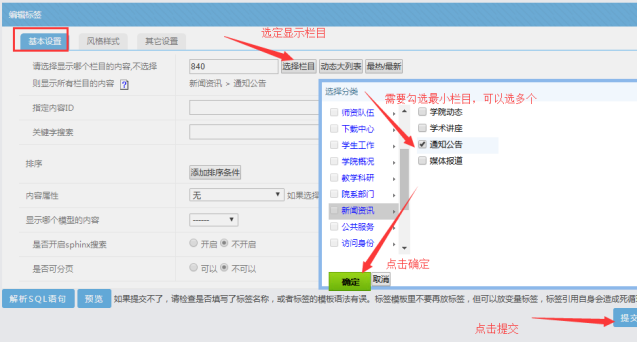 D、切換到基本設置------選擇所需顯示的欄目,可以選擇多個欄目