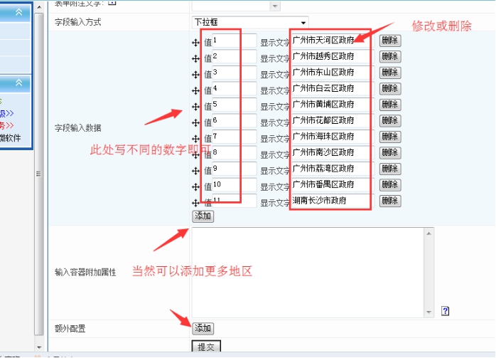 3、進入后,里面可以修改現有的地區。也可以添加更多地區。左邊的那個值是數字,可以任意添加,但是需要不同。最后點擊提交。