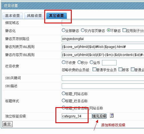 其他設置:主要就是一個欄目后綴,點擊“欄目后綴按鈕”,一般所有小列表的欄目后綴都寫為一樣,這樣很多內容就無需反復添加。