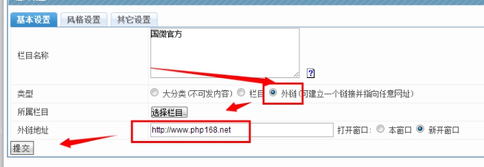 C、外鏈地址:添加一個名為"股票行情"的小欄目名稱,放在剛剛的"國際財經"上;使用外部鏈接,新窗口打開,鏈接到: