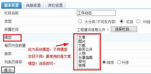 模型:系統里面有不同功能的模型,有文章模型、圖片模型、視頻模型、下載模型;我們一般都是選擇“文章模型”,文章模型里面即可發文章、圖片、視頻,也可以發下載,比較通用。