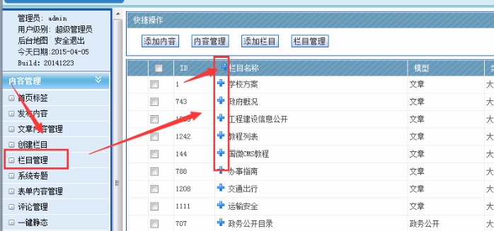 默認(rèn)的欄目是收縮的,如果需要讓欄目展開,點(diǎn)擊前面的”+”號(hào)符號(hào)