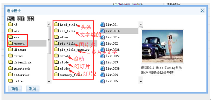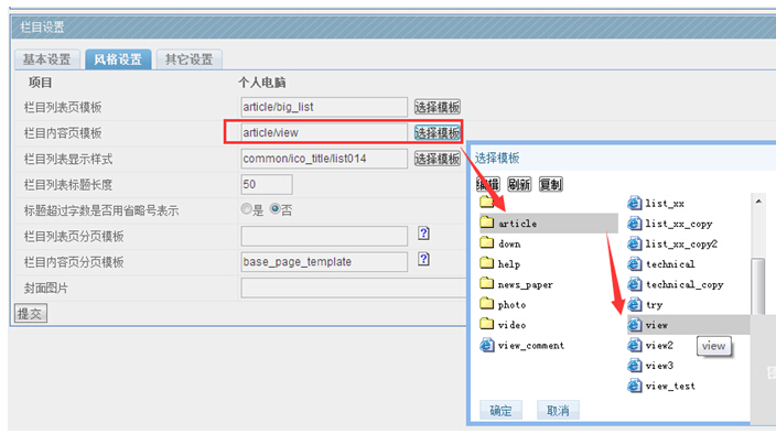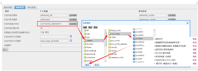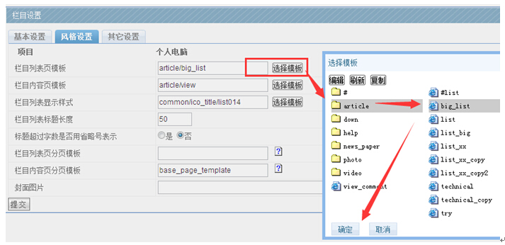 如果要修改大列表或小列表欄目模板,點擊選擇模板,然后選擇對應的模板列表