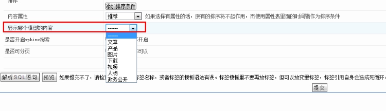 3、如果同時(shí)有只想顯示某個(gè)模型的內(nèi)容,就選擇下面的模型(此類情況一般是欄目不做選擇的情況)