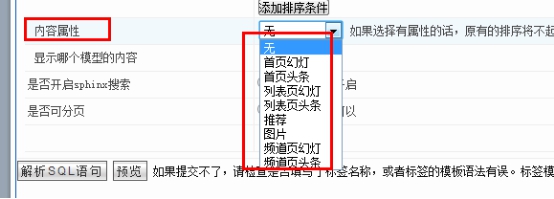 2、如果此處只想顯示該欄目特定屬性的內(nèi)容,如推薦內(nèi)容、只帶圖片的等屬性,那么這個(gè)地方可以設(shè)置: