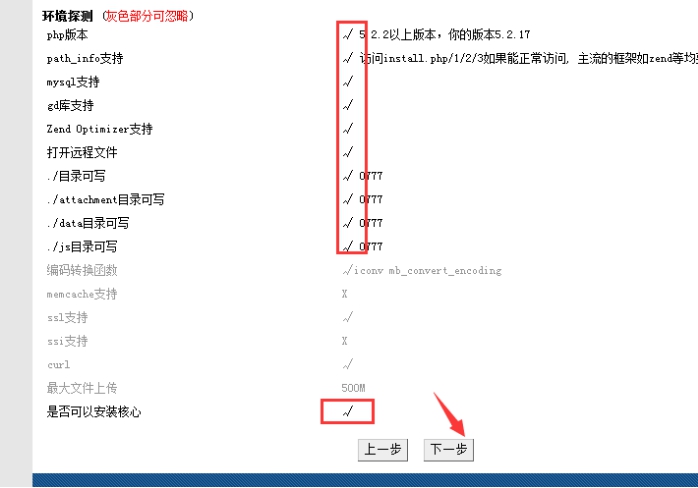 出現相關的安裝環境提示,深黑色的地方必須打鉤才能安裝,如果里面 任意一項不支持,就會提示核心無法安裝,從而無法安裝網站。淺灰色的是可選的,不一定要支持。(linux系統需要有curl插件)