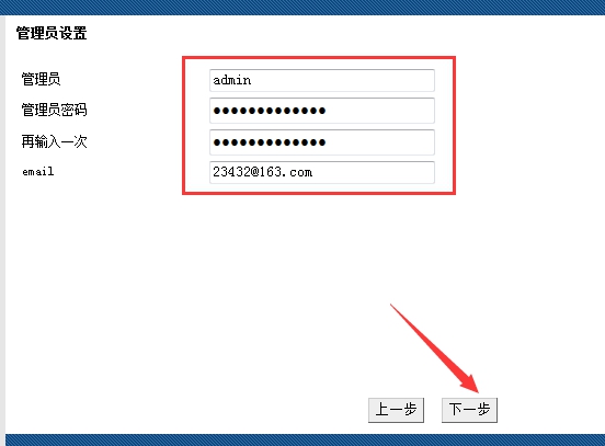 設置管理員賬號和密碼;密碼必須8位,數字+英文;然后點擊下一步