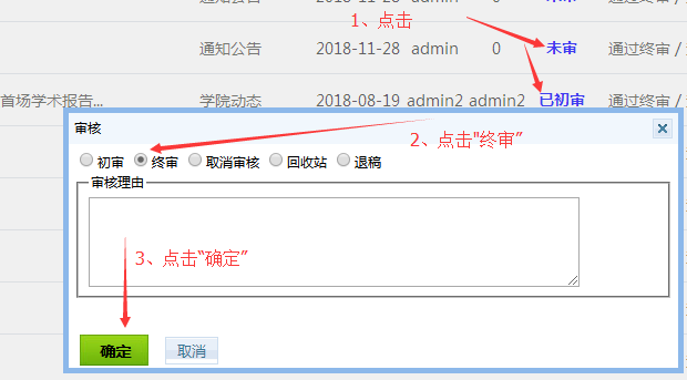 然后:選擇“終審核”(當然可以退稿)--------點擊“確定”按鈕,內容就審核通過了。