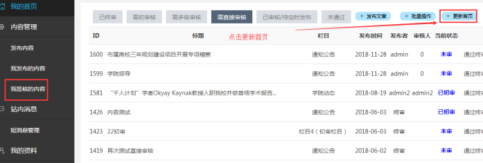 有時發布的內容,因為緩存沒有立刻在頁面上顯示;如果發布的內容要立刻看到效果,可以點擊“更新首頁”,然后刷新網站相關頁面查看效果(如果提示需要登陸后臺,則用賬號登陸后臺即可)。