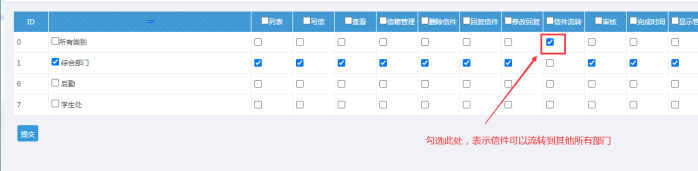 B:另外,我如果想此人對信件可以流轉給其他部門的權限,設置如下(此處一般都要設置):