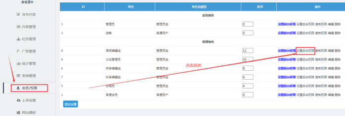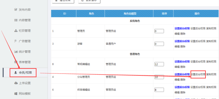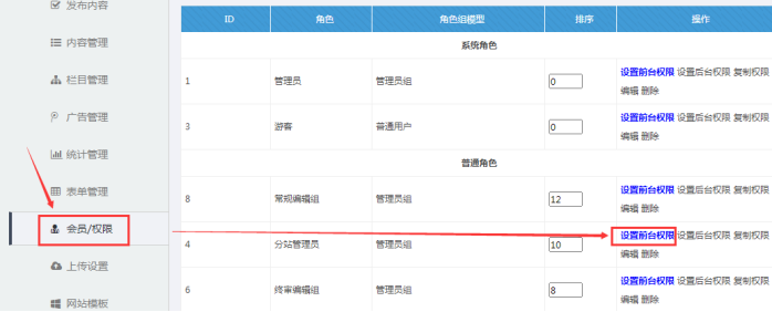 進入后臺--點擊【會員/權限】---找到【分站管理員】---點擊【設置前臺權限】