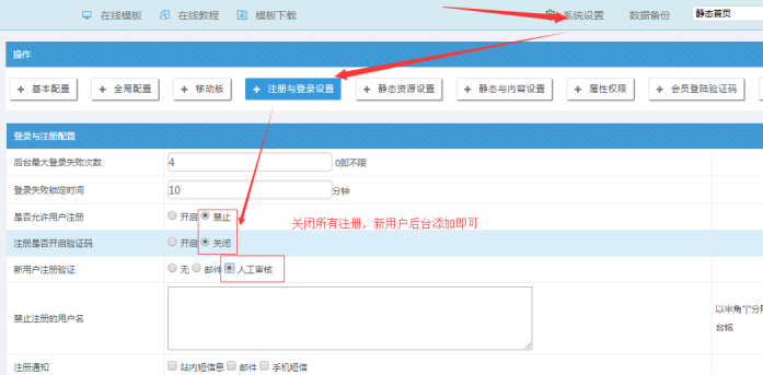 A:為了安全,一般都關閉系統注冊;采用在后臺“系統設置--會員管理”添加用戶。