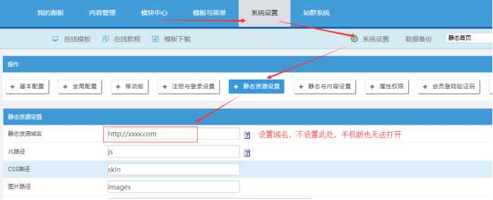 網站安裝后,靜態資源域名需要設置下,否則手機版和一些地址打開錯誤;特別是手機版,會出現重復兩個地址。(此處一般填寫自己的網站域名即可)
