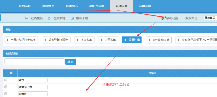 發布內容的時候,如果有敏感詞,發布內容就會提示預警。可以單個手工添加。