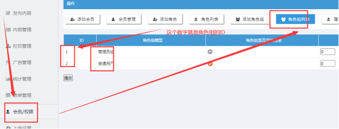 角色查找方式:進入后臺-------會員/權限-------可以看到這個列表,左邊是角色的數字ID;另外,兩個紅框的右邊,
