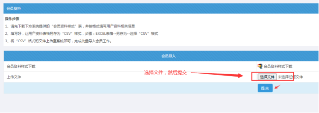 【后臺】→【會員/權限】→【批量添加會員】→【選擇文件】,點擊【選擇文件后】,彈出框中選擇要上傳的文檔,