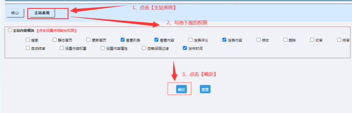 B:點擊------主站系統-----可以勾選這些(這個是權限的基礎開關,必須這里設置了,后面設置的細分權限才有效果;)---------然后點擊【確定】提交!