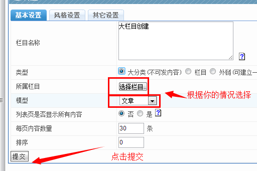 B、批量添加2個小欄目給此大列表:國內財經 國際財經;屬性為小列表;模型也為文章模型;顯示30條