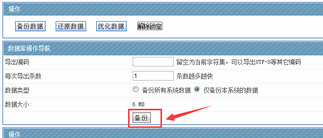 直接選擇僅備份本系統數據,直接點擊備份即可,其他都默認:導出編碼留空,每次導出條數默認為1,數據類型僅備份本系統數據即可。