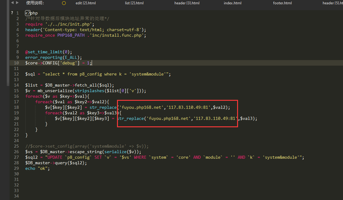 2、編輯這個(gè)p8_config.php,將里面的兩個(gè)新舊域名修改為你項(xiàng)目的,左邊的是新域名,右邊的是舊域名,修改后保存
