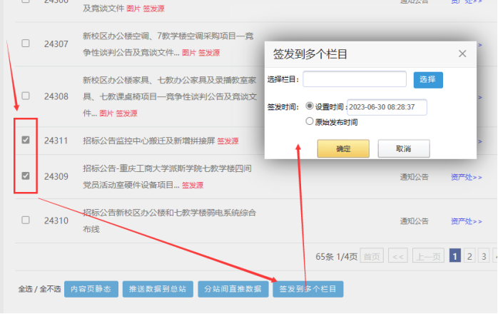 3、【勾選】對應需要簽發到多個欄目的內容------點擊【簽發到多個欄目】----看到一個彈出框