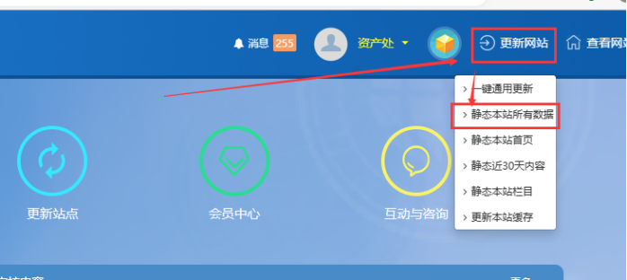 B、在后臺鼠標放在【更新網站】按鈕上--------點擊【靜態本站所有數據】,就手工更新了所有內容了