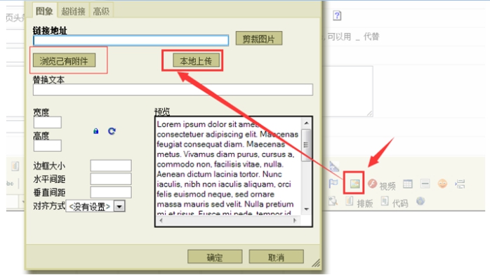 A:點擊編輯器里面的圖片按鈕----彈出框里面-----選擇本地上傳