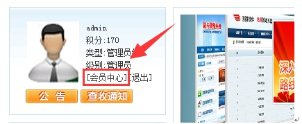 登陸后,會出現登陸信息,點擊“會員中心”四個字可以進入會員中心;會員中心的作用主要是發布、管理自己的內容;同時管理員審核內容的地方。