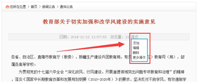 打開某篇內容,直接點擊“操作”二字,可以看到相關操作權限,沒有權限看不到。