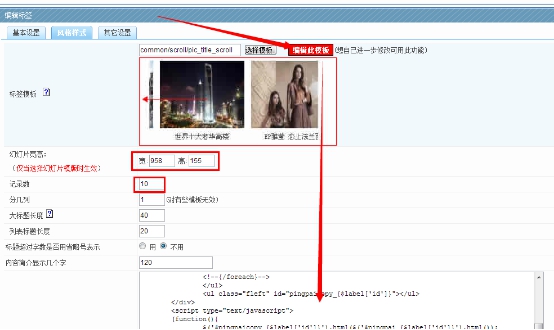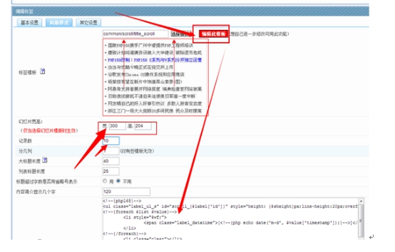 2、點擊編輯此模板----在下面的框中,刪除現在的代碼;然后將下面我們提供的代碼復制進去,另外幻燈片的寬高,按圖片提供的:300和204,最后提交即可。