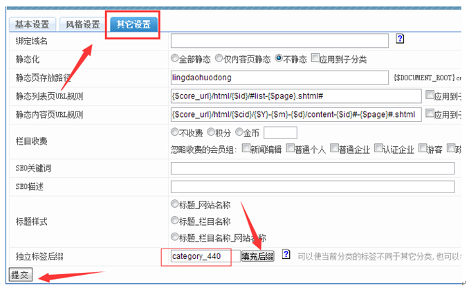 點擊其他設(shè)置,點擊填充后綴,會產(chǎn)生一個和欄目ID相同的數(shù)字(獨一無二的);如果想改為和其他相同后綴,就改下那個比如440的數(shù)字,然后點擊提交即可。