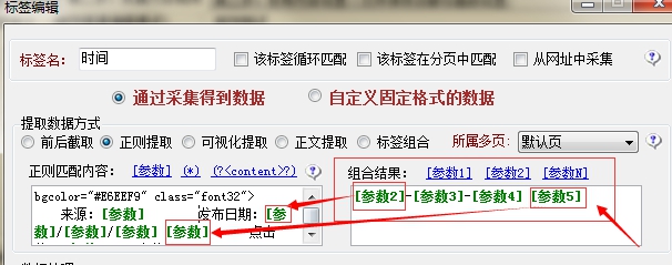 在“發(fā)布日期:”后面,將原來(lái)的時(shí)間信息2015/3/9 17:55:26分成四段來(lái)進(jìn)行提取,將年、月、日和后面的小時(shí)分鐘秒數(shù)分開(kāi)提取,由于每個(gè)頁(yè)面中來(lái)源也是變化的,所以來(lái)源后面也需要用一個(gè)參數(shù),具體的設(shè)置如下所示: