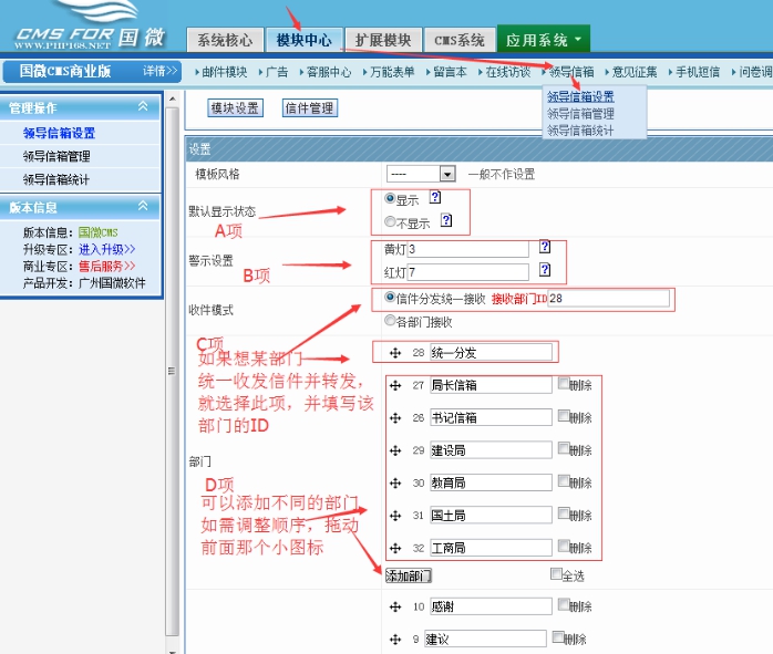 信件接收統(tǒng)一分發(fā):就是用戶提交信件時候,不需要在選擇部門了,默認發(fā)到某指定的部門信箱。然后再由此信箱轉發(fā)給其他部門;至于由哪個部門(或欄目)接收信件,只需用戶填寫部門ID即可。比如我們命名了一個統(tǒng)一分發(fā)的部門欄目,ID為28填入即可。