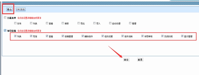 點擊“核心”----勾選需要的權限,如果是部門管理員,就勾選所有按鈕;點擊確定。