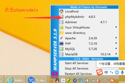 啟動wamp環境后,鼠標左鍵點擊,電腦右下角底部的WAMP的圖標,在彈出框中,選擇“phpmyadmin”