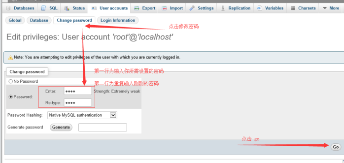 然后點擊“change password”,修改數據庫密碼------兩次輸入你要修改的密碼,然后點擊“go”提交。
